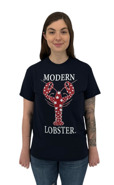 A Dry Blend® t-shirt featuring our Star-Spangled Lobster. This design seamlessly blends American pride with coastal charm, creating a stylish and eye-catching look.